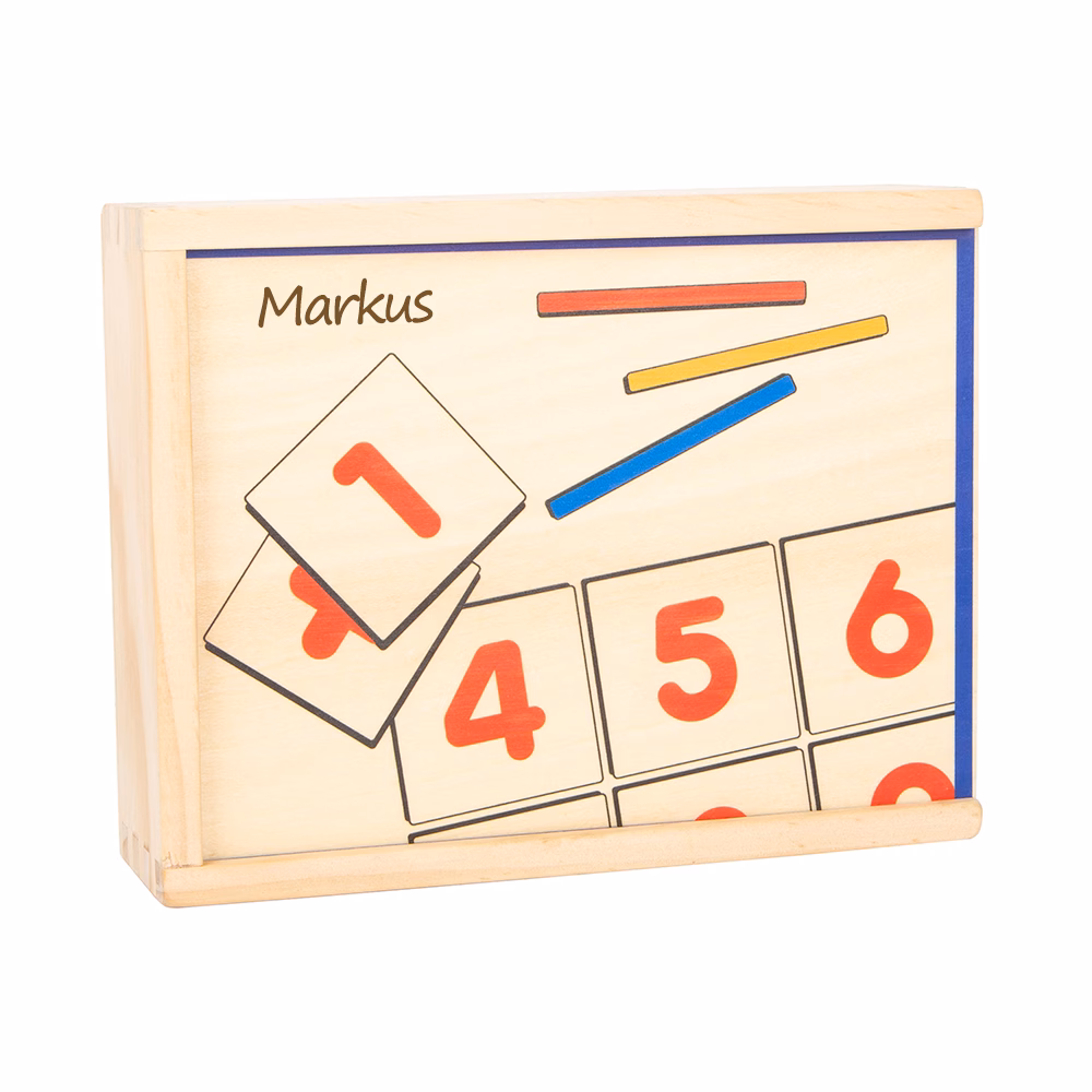 Kõik numbriplaadid ja arvutuspulgad on turvaliselt hoiustatud puidust liugkaanega kastis, mida on mugav kaasa võtta.