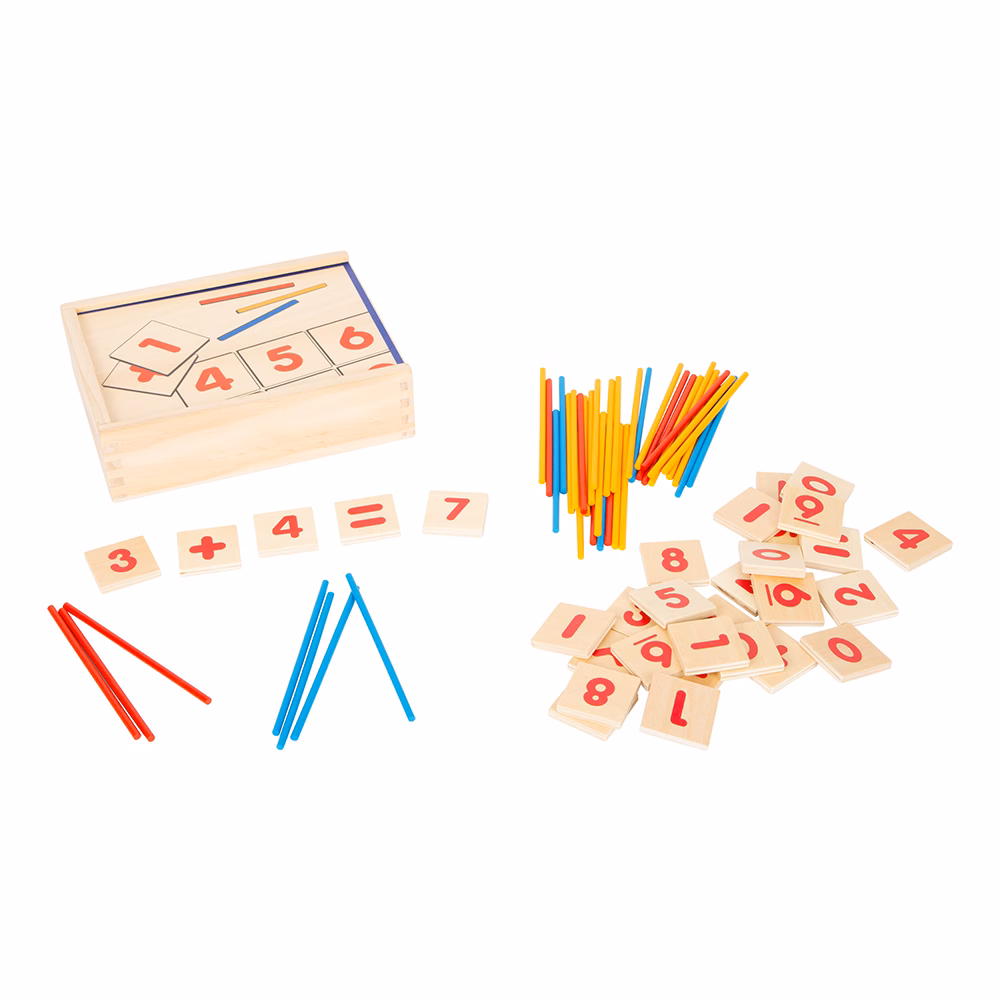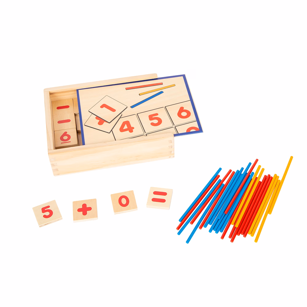 Värvilisi arvutuspulki ja puidust plaate saab kasutada liitmise, lahutamise ja võrdlemisülesannete lahendamiseks.