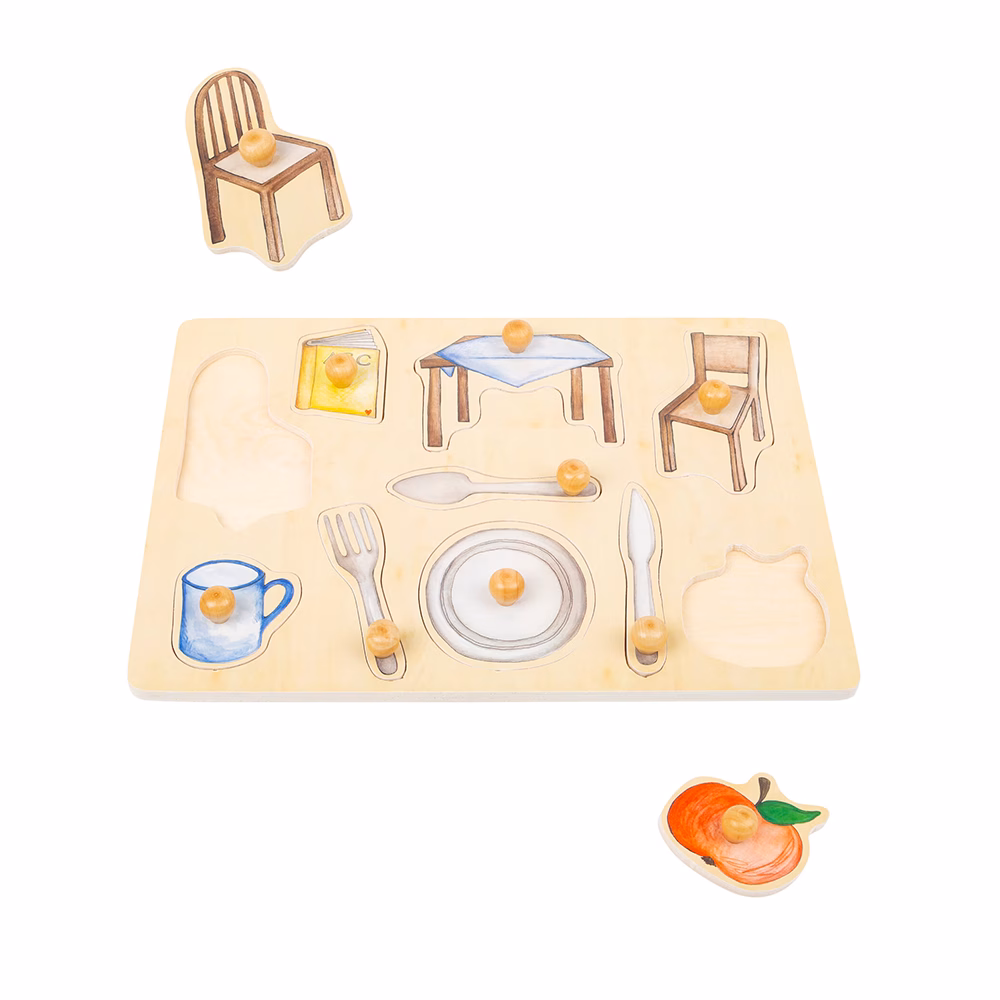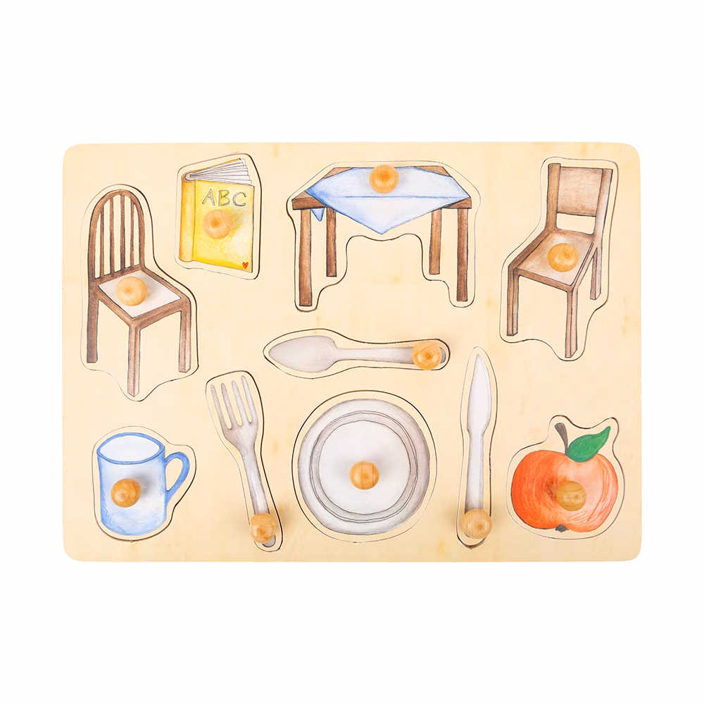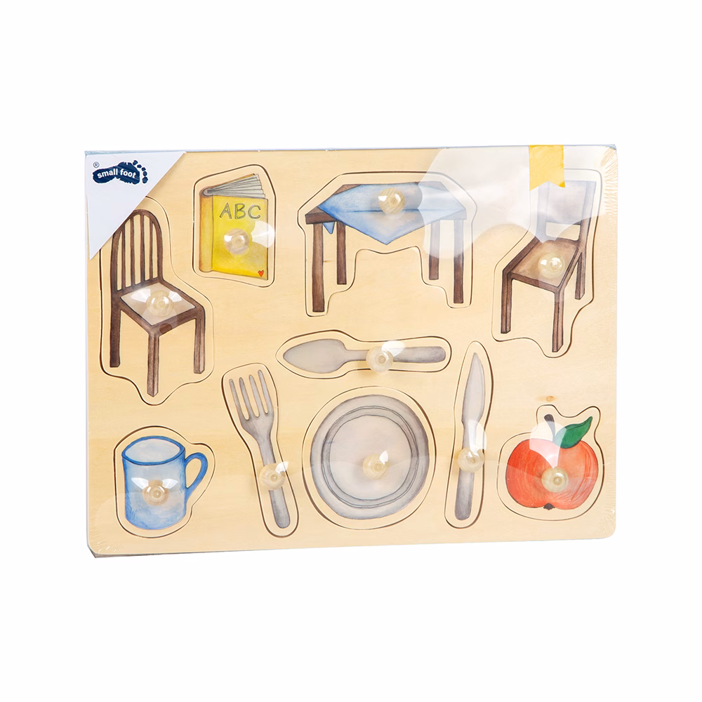 See vastupidav puidust pusle sisaldab käsitsi maalitud pusletükke puidust nuppudega, mis kujutavad igapäevaelu esemeid.