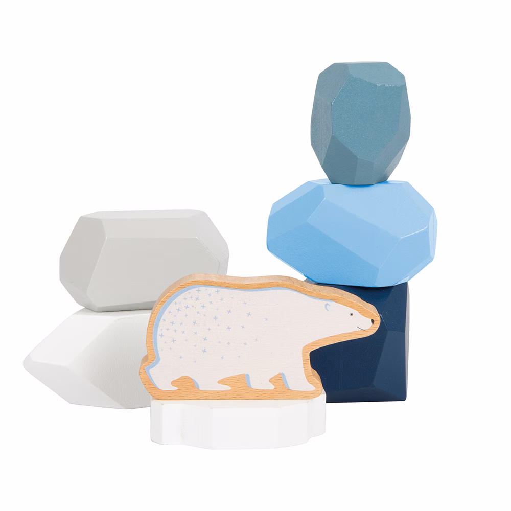 Kolm loomakujukest ning üks jääpanga kujuline kivi koos värviliste tasakaalukividega loovad arktilise mängumaailma ja innustavad loovust.