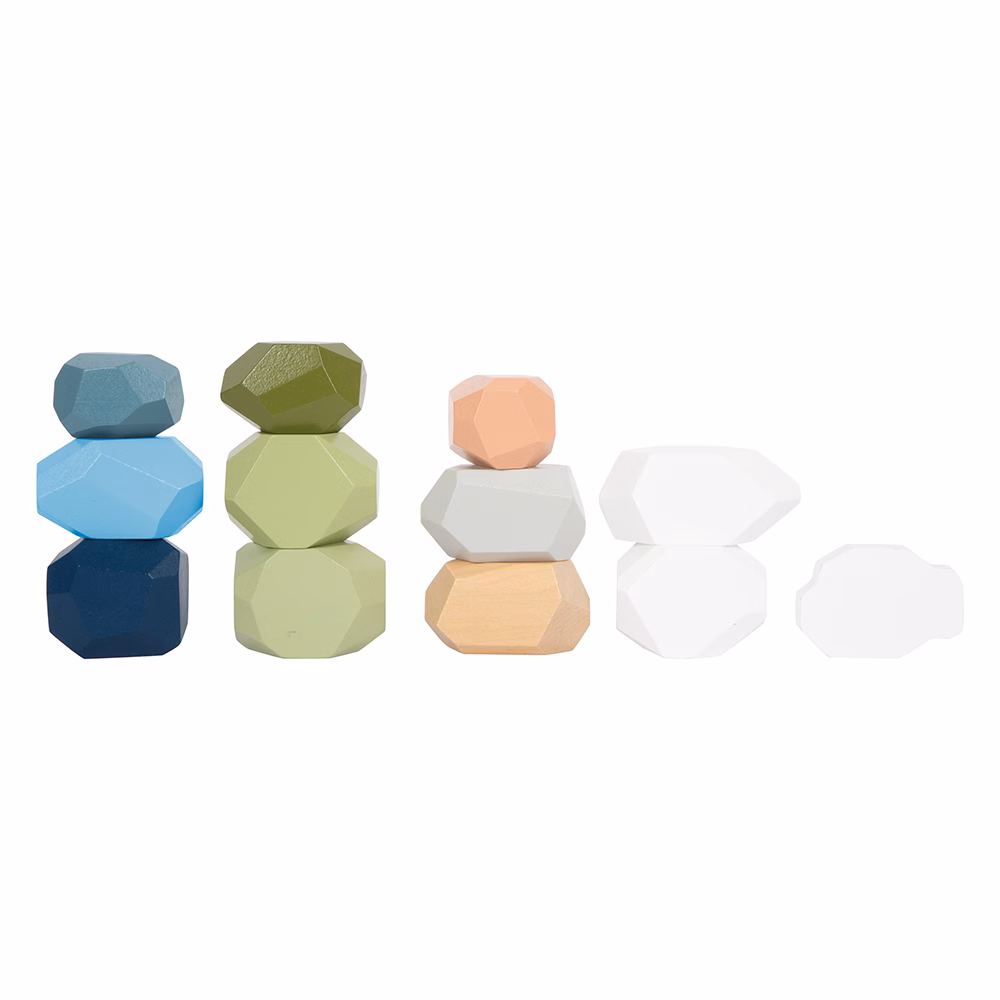 Montessori õpimeetodist inspireeritud 11 eri suuruse, nurkade ja ebaühtlaste külgedega kalliskivilaadset tasakaalukivi, mis on valmistatud FSC® 100%-sertifitseeritud puidust, arendavad peenmotoorikat ja keskendumisvõimet.